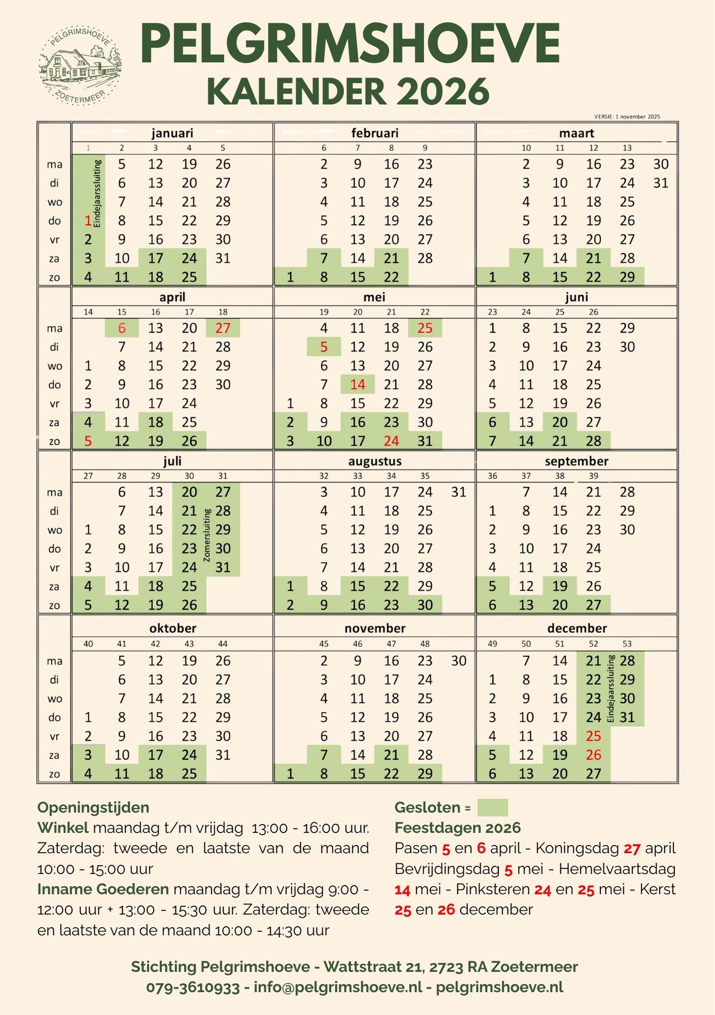 Overzicht openingsdagen en -tijden 2026